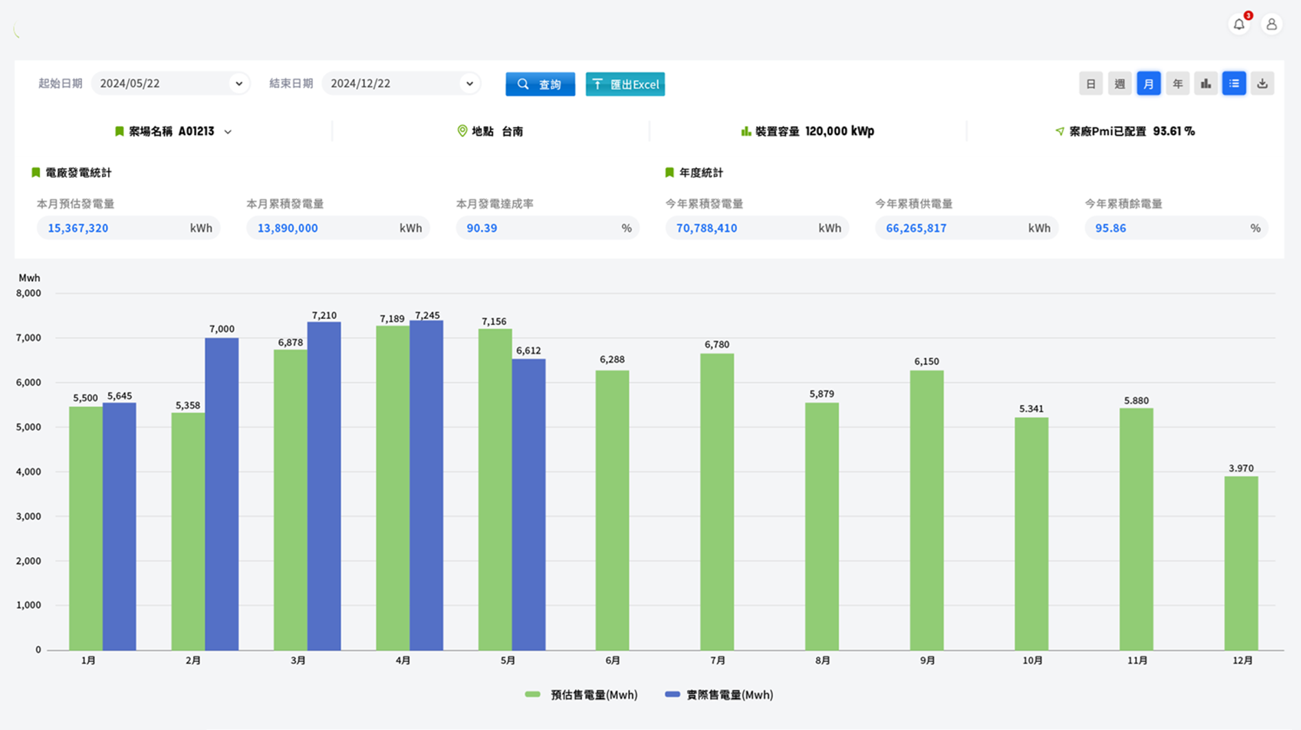 採用視覺化比對介面,直覺呈現「合約容量 × 發電實績」之對應關係