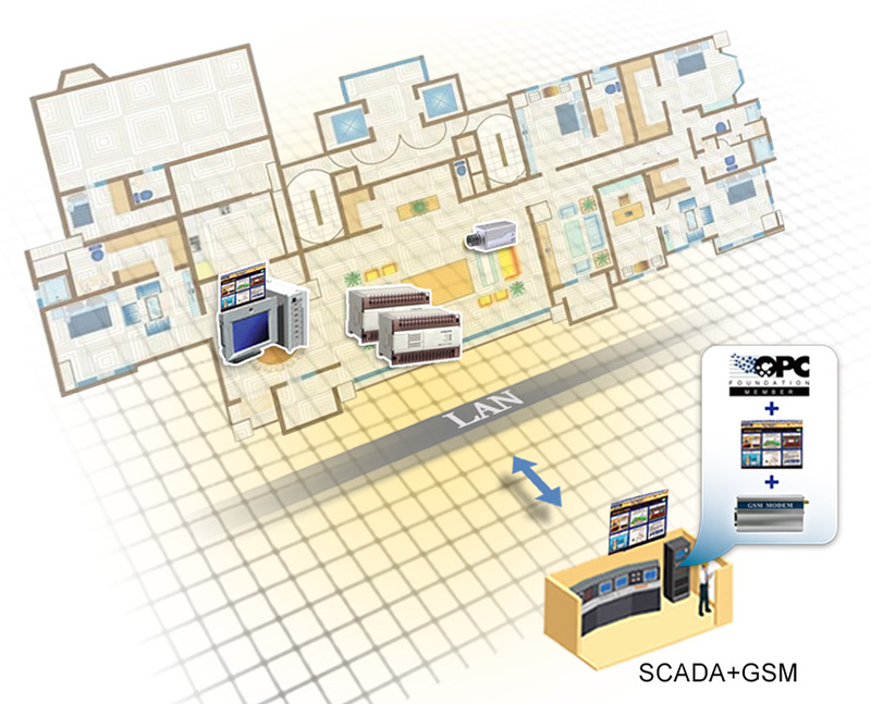 利用高穩定度的PLC來控制家庭的燈光亮度及各樓層火警警報、入侵警報,再利用圖控軟體顯示人性化的圖形監控畫面,