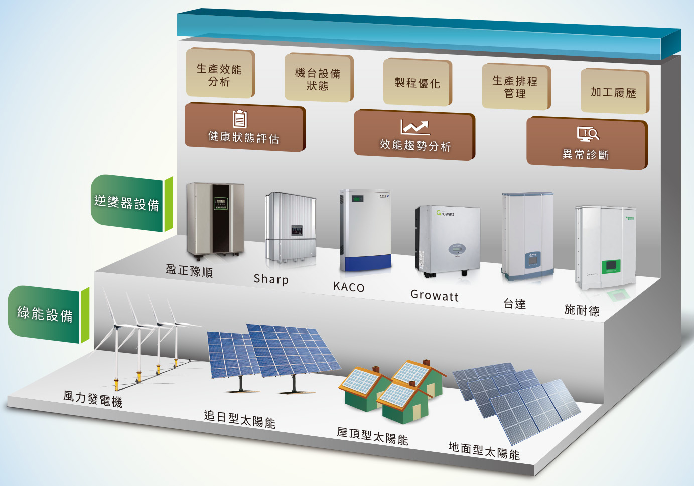 太陽能監控系統支援各廠牌變流器Inverter、太陽能系統相關設備 ( 數位電表、收集器、控制器、轉換器、感測器…等)通訊連結, 並執行訊號擷取、運算、分析、控制等功能 。