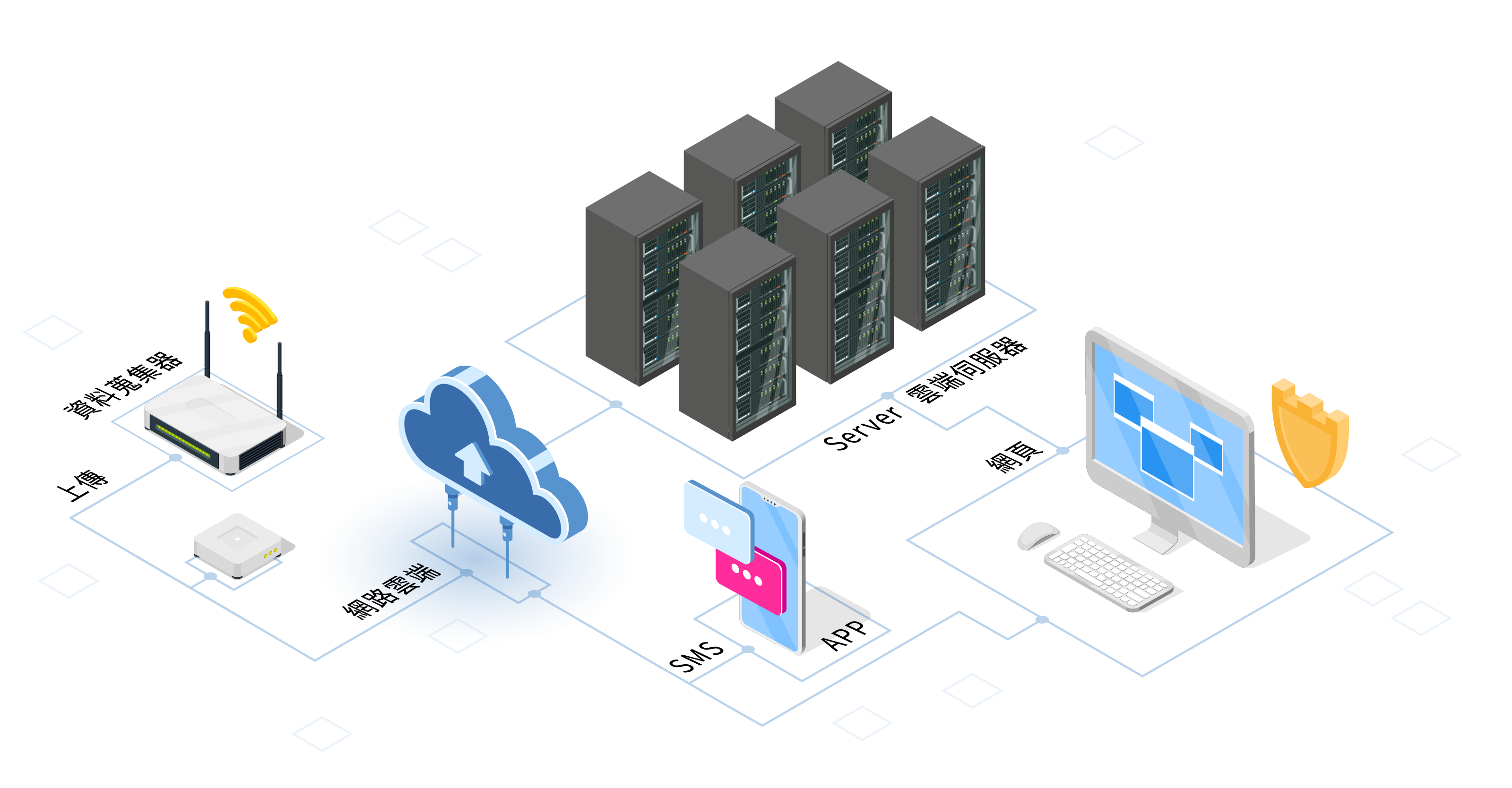 雲端伺服器結合資料收集器與網頁伺服功能於一身, 使用者可以透過網際網路在任何時間地點監看太陽能電廠的發電資訊, 雲端伺服器會擷取於太陽能案場之資料收集器回傳的信息, 有效的將收集器中的太陽能發電資訊儲存、收集與分析, 並將發電資訊及警報事件在記憶體中, 雲端伺服器內建網路伺服器(Web Server)使用者可透過Google Chrome瀏覽器進入瀏覽資料, 太陽能監測收集器同時會自動將資料回傳到雲端伺服器, 使用者可輸入專屬的帳號密碼進去遠端瀏覽資料, 系統業者可透過系統帳號進去同時管理多個太陽能案場,並產生日報、月報表及年報表, 內建Mail Server, 可將Logger資料擷取收集器,警報發生時會自動送出Email通報, 以確保系統維持在最佳的狀態。
